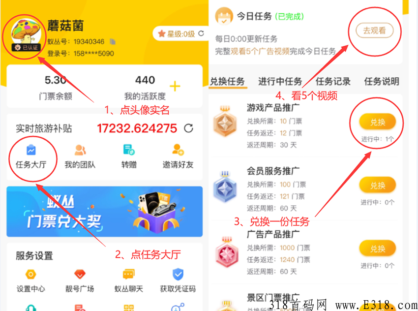 1、扫码注册下载,实铭认证,点任务大厅兑换游戏产品推广任务1个,每天任务就是看5个视频可得